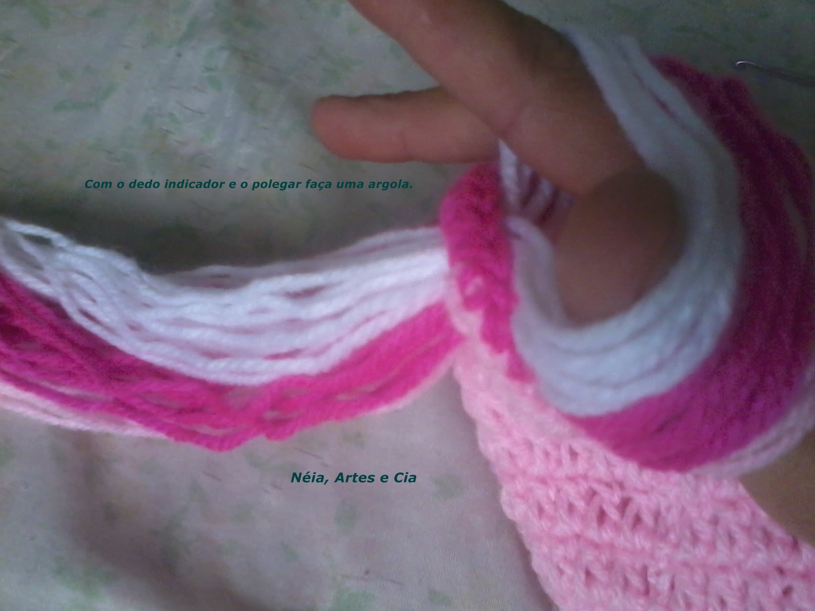 Faça agora 8 pontos baixos por mais ou menos 10 carreiras. Corte o fio comprido para costurar na touca depois. Faça a outra antena igual a esta. Coloque o enchimento, mas não muito para não aparecer, e costure na touca.